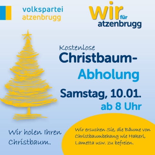 Am Samstag, den 10.1.2025, ab 8 Uhr morgens, fahren wieder fleißige Helfer im gesamten Gemeindegebiet der Marktgemeinde Atzenbrugg herum, um die Christbäume einzusammeln.