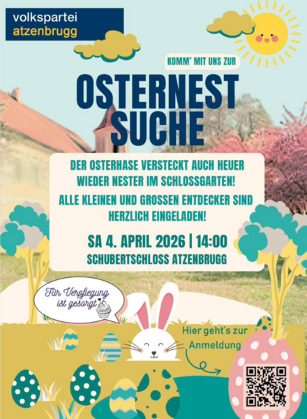 WIR laden wieder Groß & Klein zur Osternestsuche in den Atzenbrugger Schlosspark ein. Damit alle Kids ihre Überraschung finden können, bitten wir um Anmeldung unter folgendem Link: